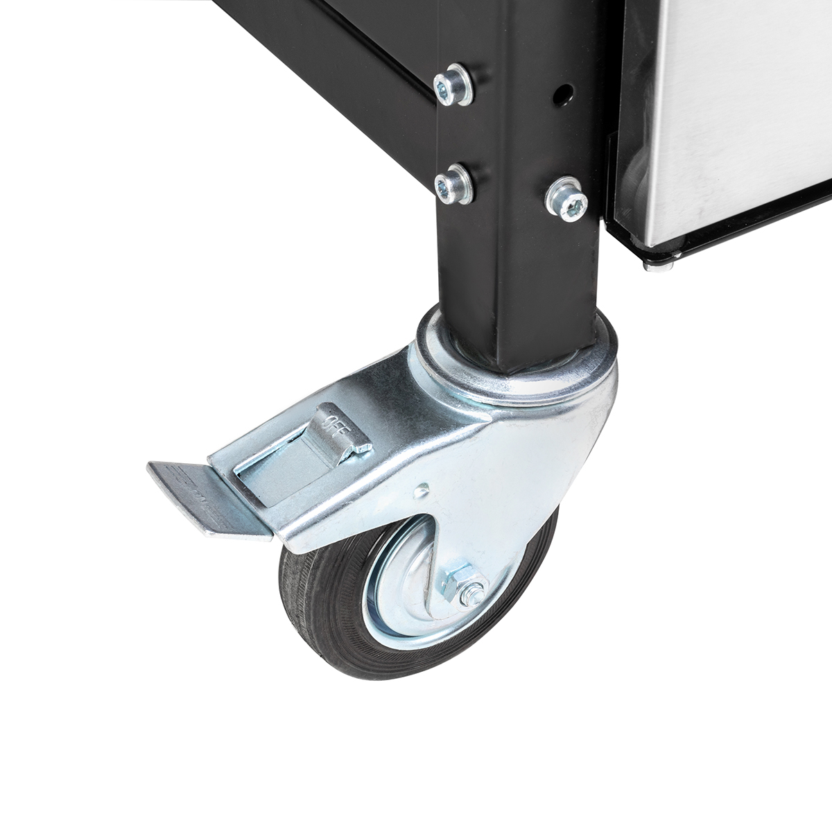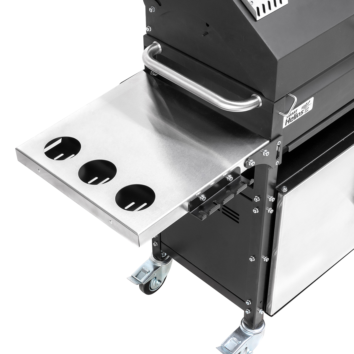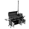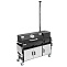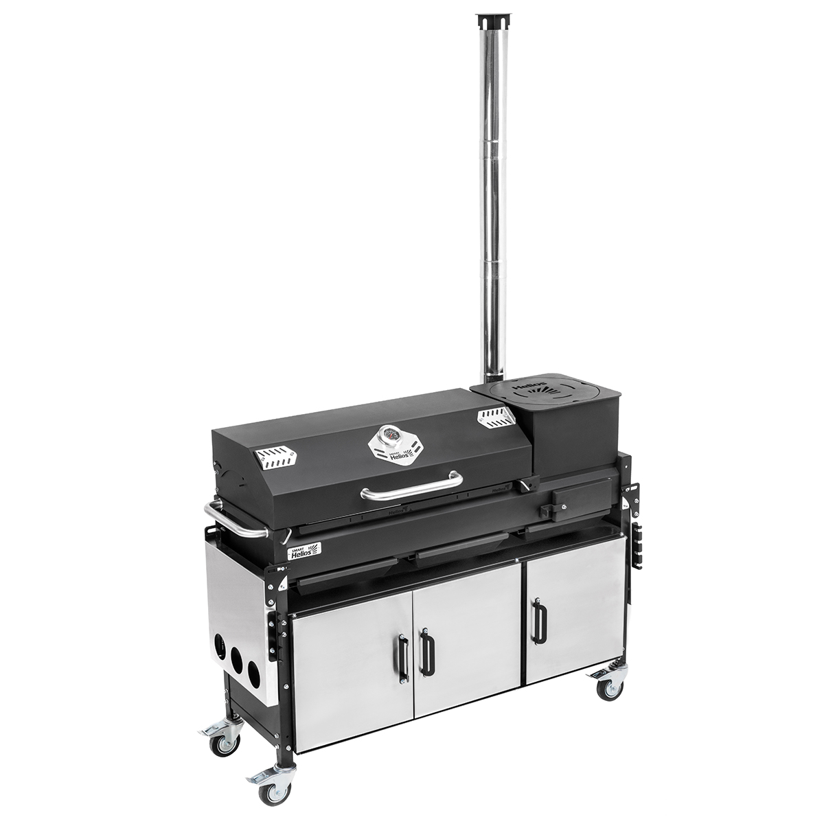 Мангал оснащен всем необходимым для комфортного приготовления блюд на открытом огне: жаровней с перфорированным дном, крышкой-гриль, угольным лифтом, 2-мя решетками-гриль из пищевой нержавеющей стали, датчиком температуры, 3-мя съемными зольниками, 2-мя боковыми столиками (с подстаканниками и без), удобным шкафом с 3-мя дверками из нержавеющей стали для хранения посуды и утвари, держателями инструментов, усиленными поворотными колесами с тормозом и боковой ручкой для удобства перемещения мангала.