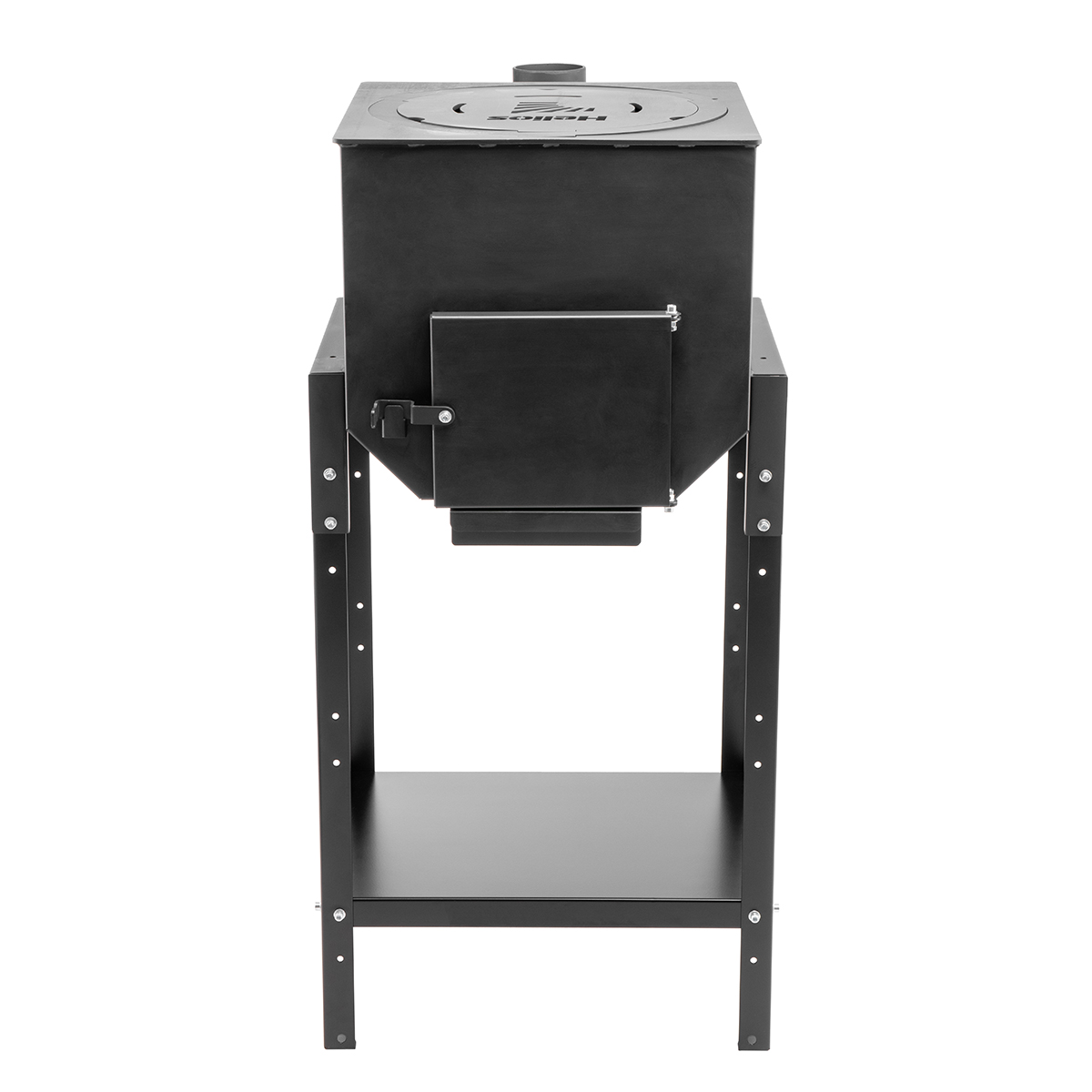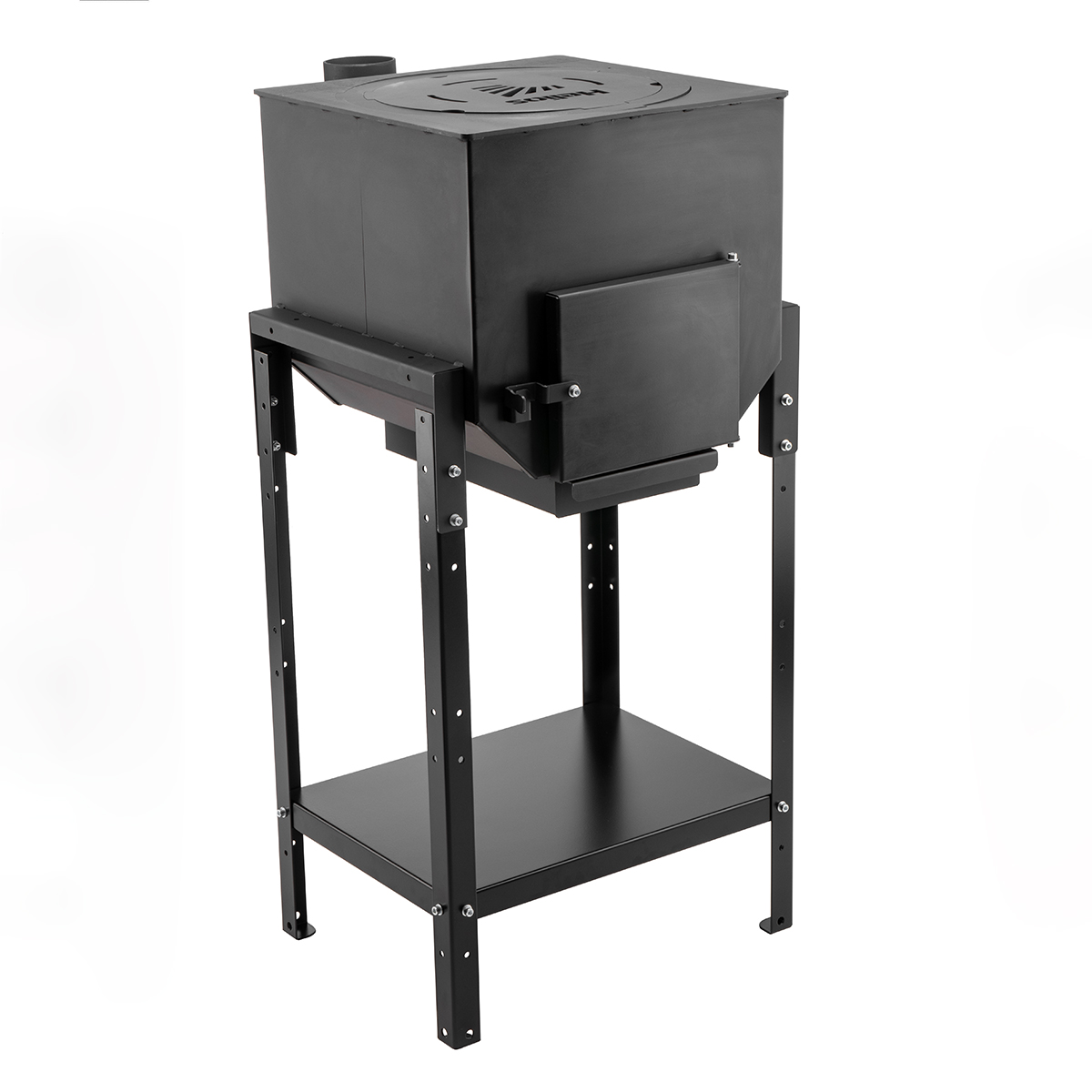 Печь предназначена для приготовления или разогрева еды на открытом воздухе, террасах и площадках под навесом, где имеются системы отвода дыма. Используется как печь под казан или как варочная плита с конфорками. Печь выполнена из стали толщиной (2 мм (корпус) и 5 мм (крыша корпуса, кольцо, конфорка) и окрашена в черный цвет специальной термостойкой кремний-органической краской, ножки и полка покрыты порошковой краской.